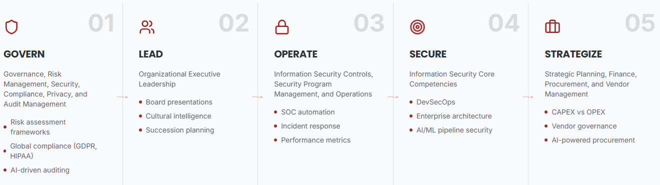 De 5-daagse CCISO training is een uitgebreide voorbereiding op C|CISO of Associate C|CISO examen (afhankelijk van uw werkervaring) waarin deelnemers worden getoetst op hun kennis in onderstaande vijf C|CISO praktijkgebieden/domeinen:
